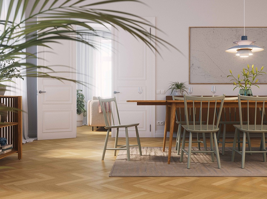 Det klassiske sildebensformatet med planker på 340 x 68 mm gir et raffineret og eksklusivt uttrykk. Tregulvet har et tidløst uttrykk som passer inn i både moderne og klassiske boliginnredninger.